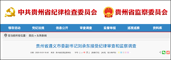 贵州省纪委监委网站10月31日消息,贵州省遵义市委副书记刘承东涉嫌严重违纪违法,主动投案,目前正接受贵州省纪委监委纪律审查和监察调查。