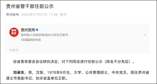 2024年12月,贵州省委组织部曾发布公示,称刘承东拟任市(州)党委副书记。随后,他出任遵义市委副书记,直至此番被查。