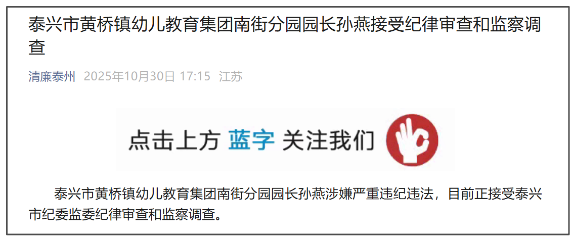 微信公众号“清廉泰州”消息,江苏泰兴市黄桥镇幼儿教育集团南街分园园长孙燕涉嫌严重违纪违法,目前正接受泰兴市纪委监委纪律审查和监察调查。