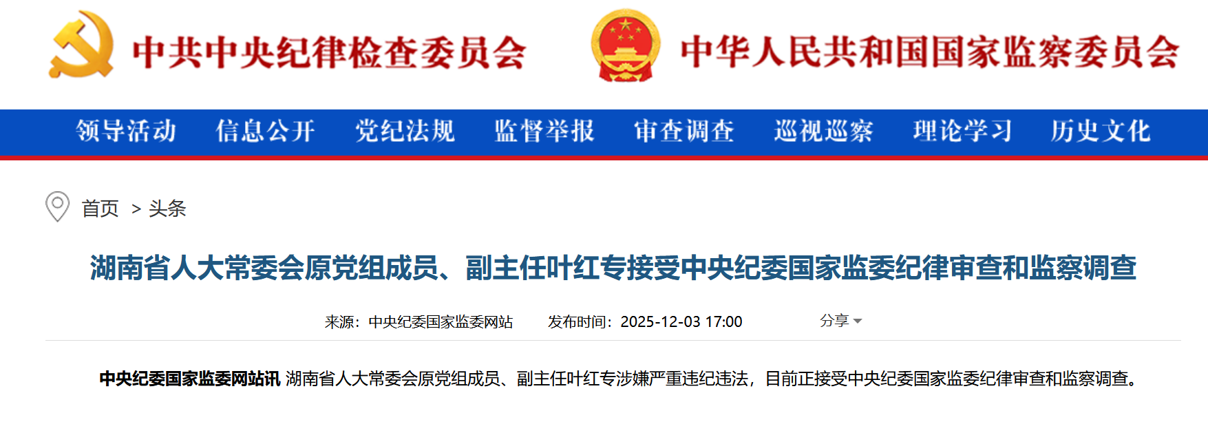 中央纪委国家监委网站12月3日消息,湖南省人大常委会原党组成员、副主任叶红专涉嫌严重违纪违法,目前正接受中央纪委国家监委纪律审查和监察调查。
